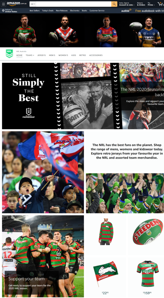 The NRL brand store consisted of a homepage that promoted the league as a whole and also featured additional, product specific pages for each team. The customer experience for NRL supporters is now more enjoyable and centralised as they were able to source all licensed NRL merchandise in a central location. The store also encouraged licenced stockists to sign on to the platform and take advantage of Amazon’s high traffic.
